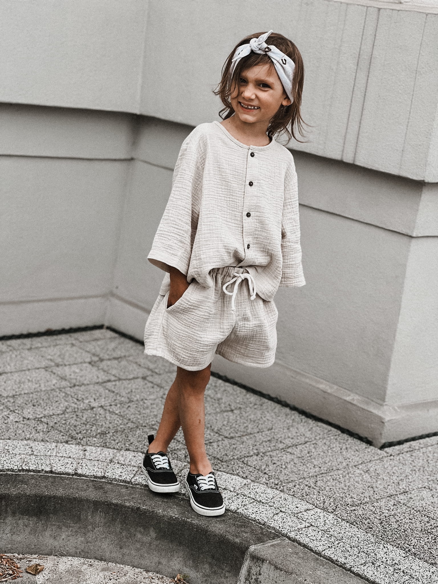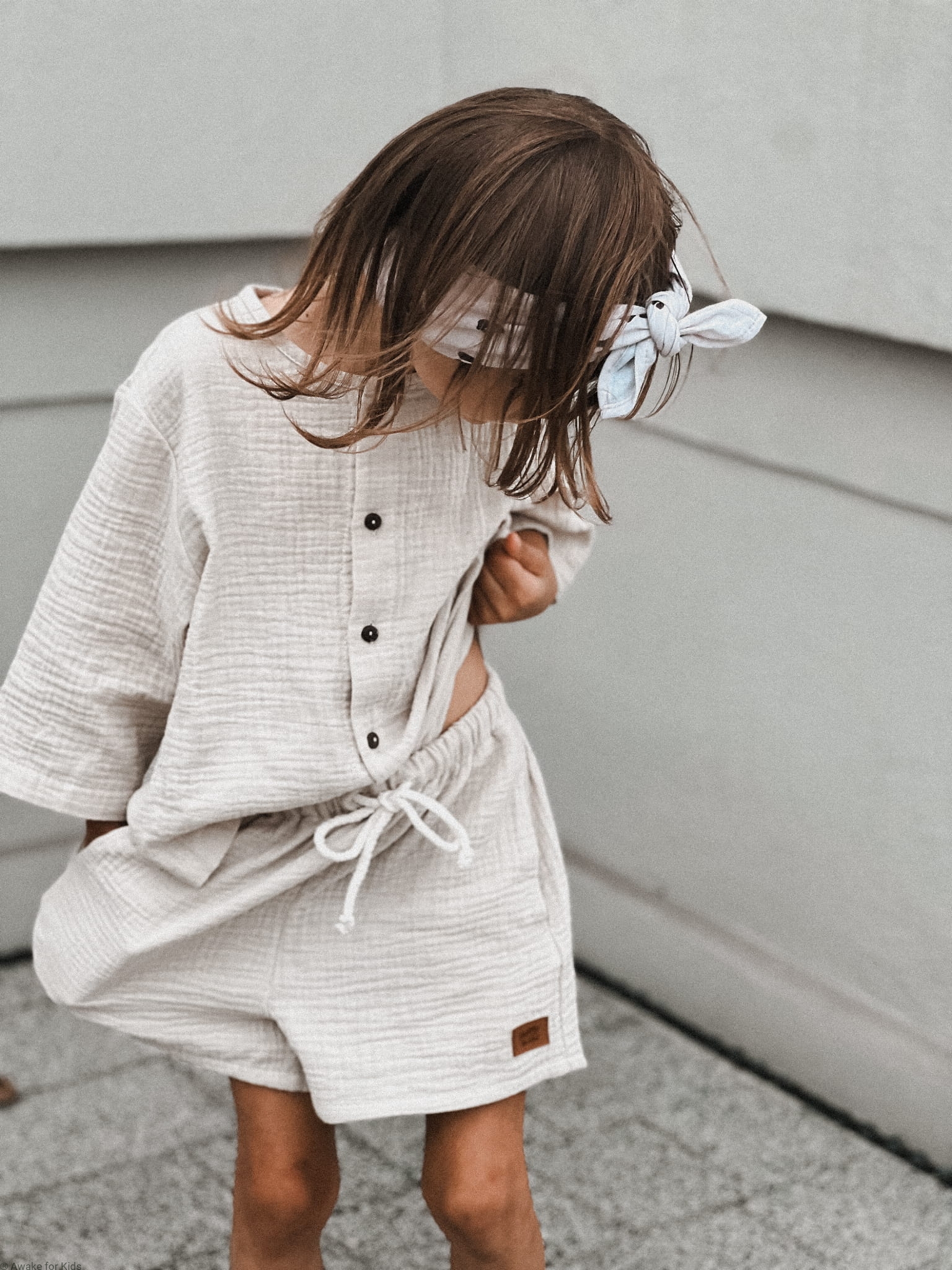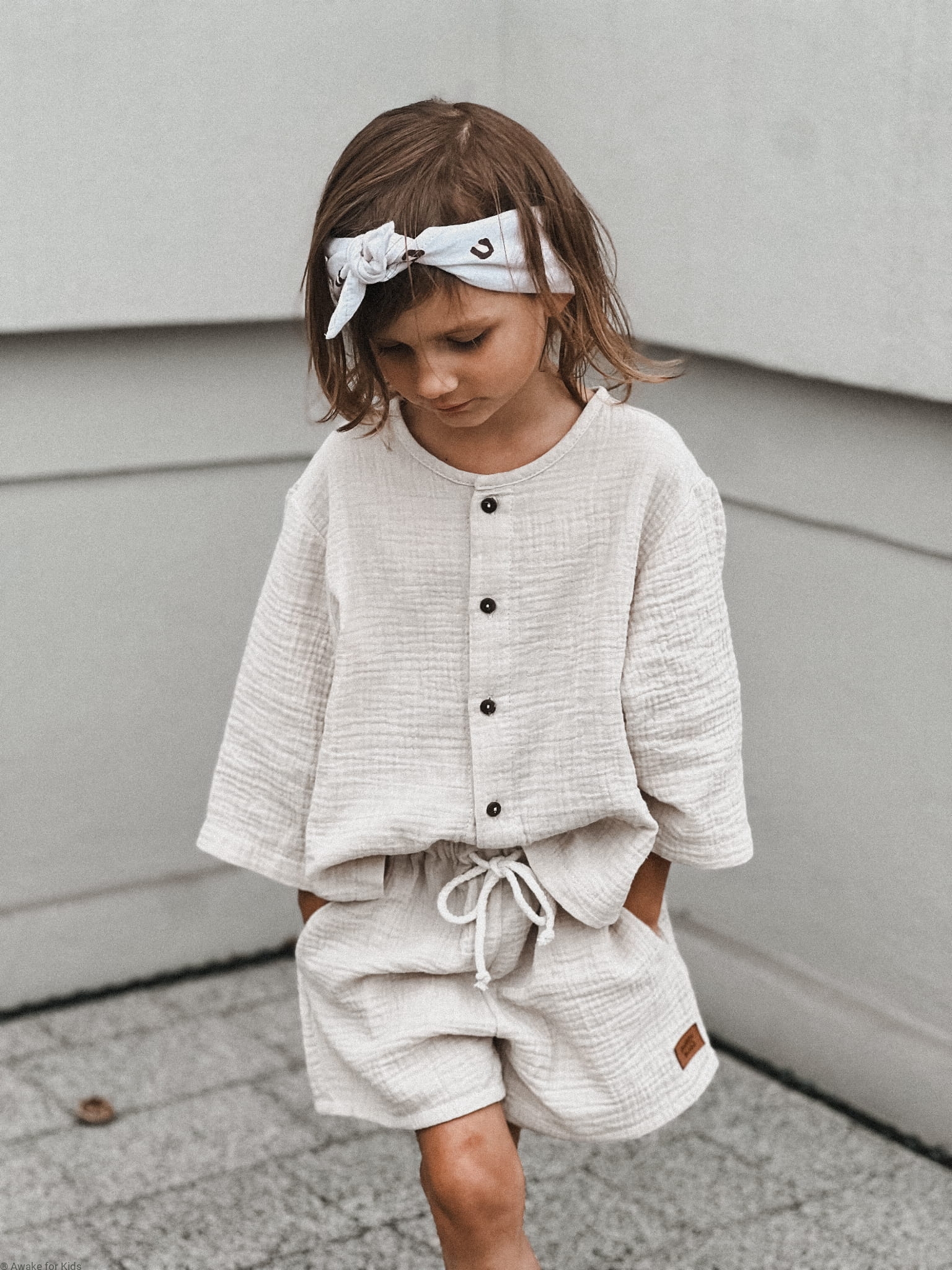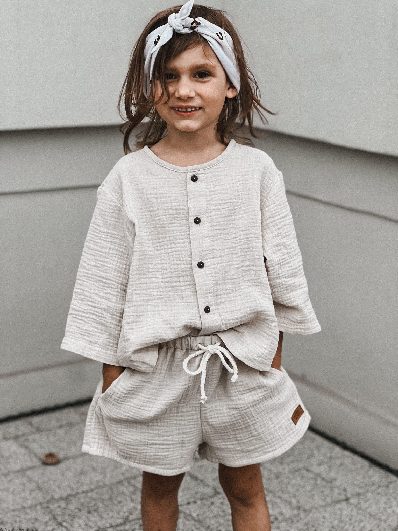 Koszula ma wygodny krój oversize, jest zapinana z przodu na kokosowe guziki. Ma szeroki wygodny rękawek który można podwinąć do długości 3/4. Spodenki mają kieszonki na skarby i sznureczek w pasie do regulacji szerokości