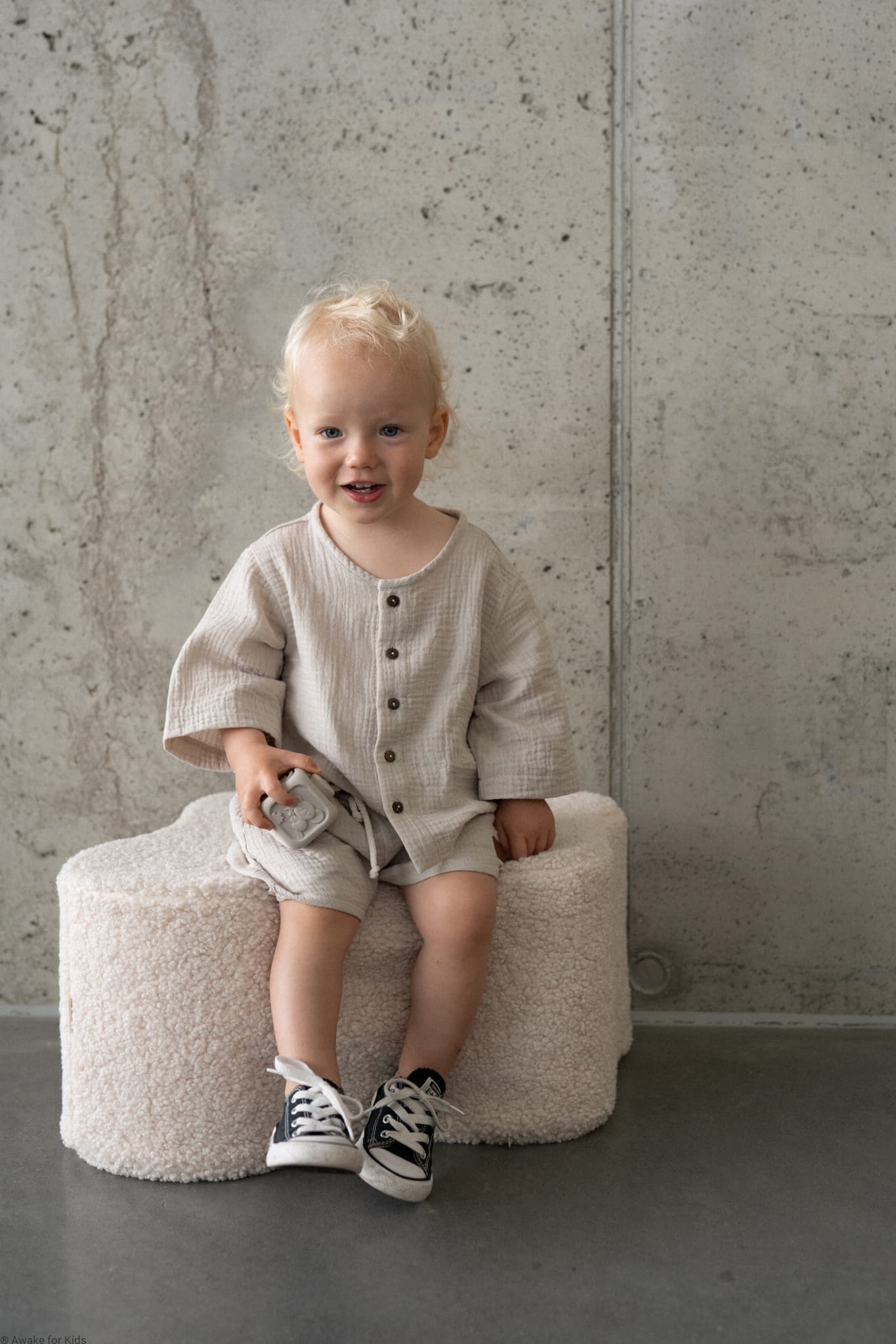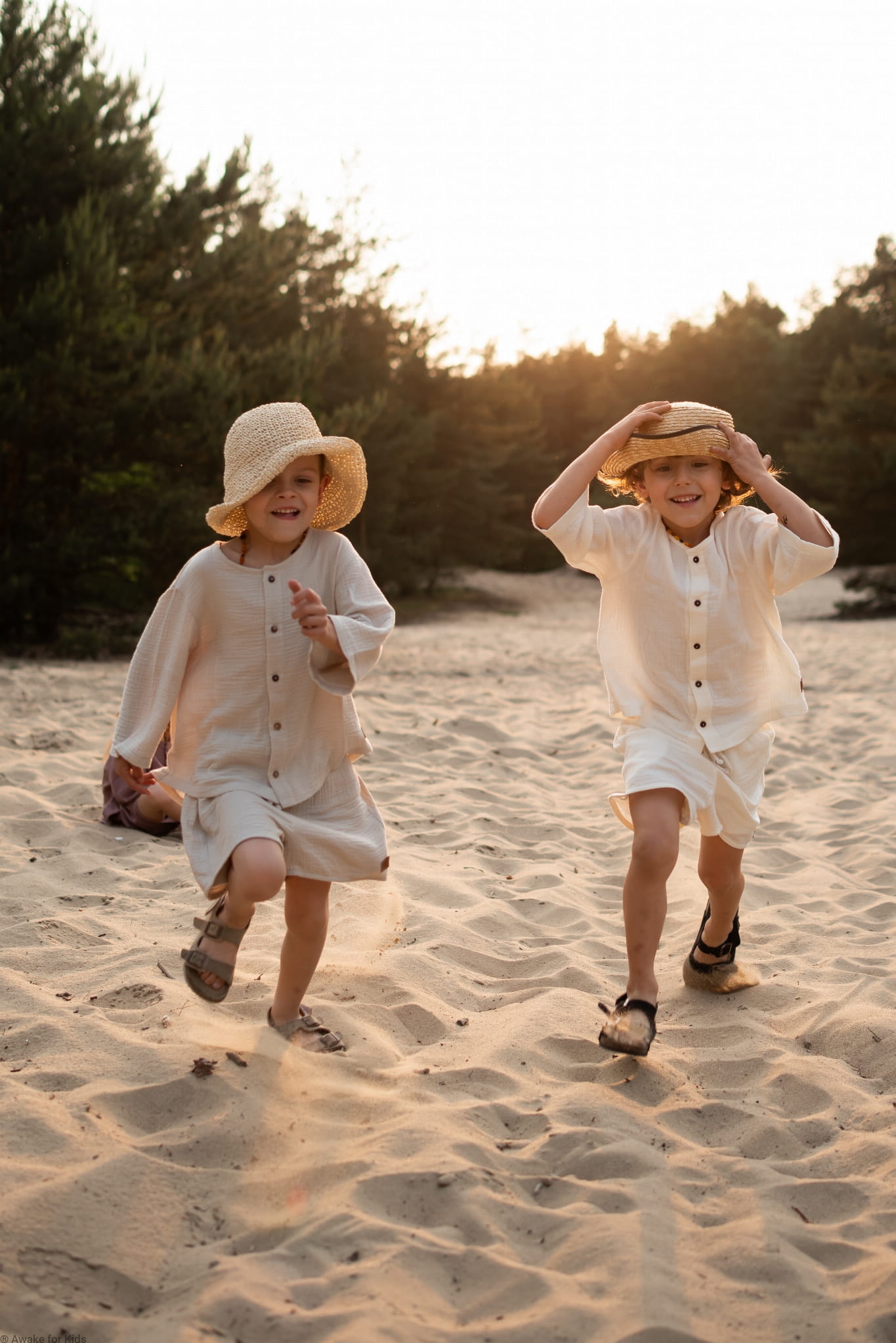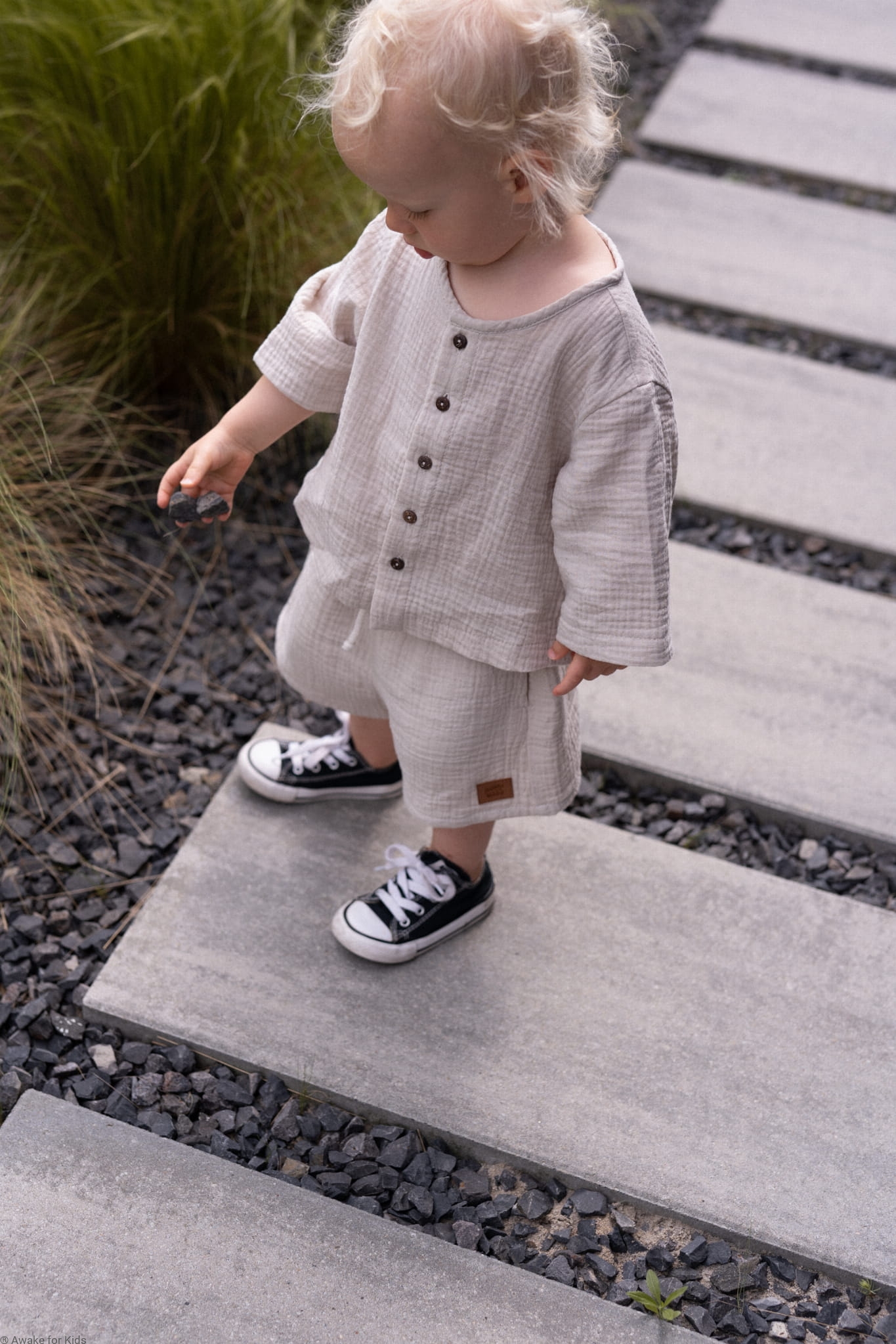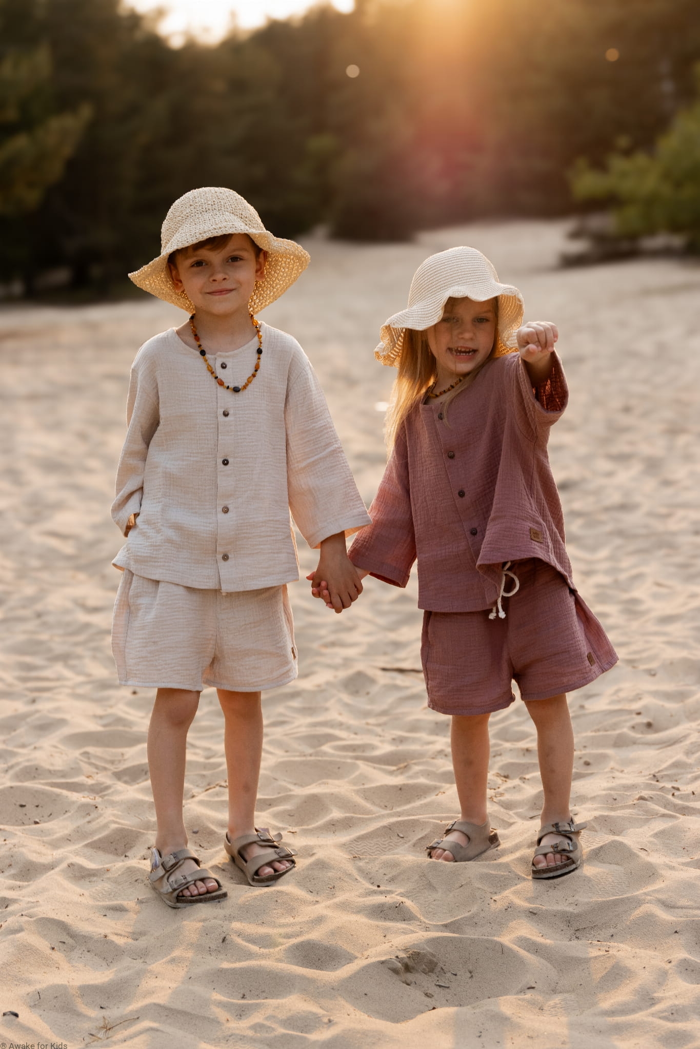 Koszula ma wygodny krój oversize, jest zapinana z przodu na kokosowe guziki. Ma szeroki wygodny rękawek który można podwinąć do długości 3/4. Spodenki mają kieszonki na skarby i sznureczek w pasie do regulacji szerokości