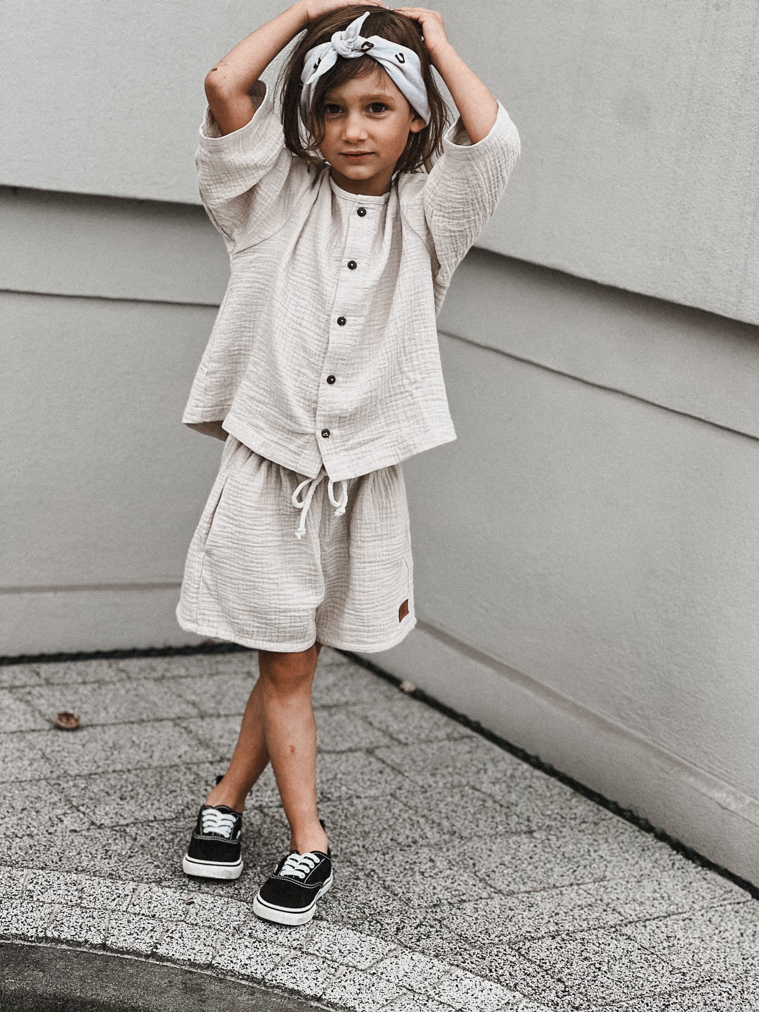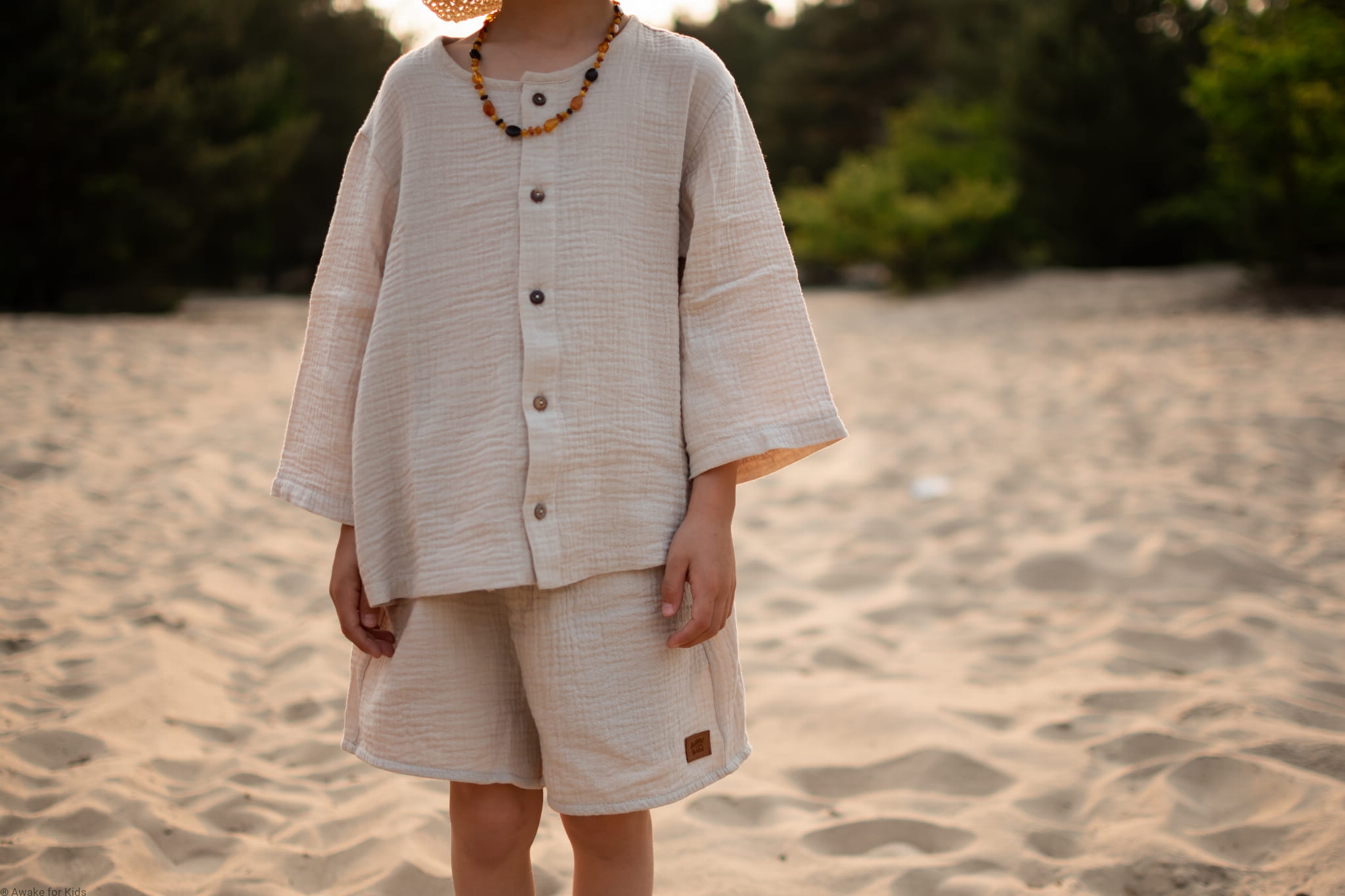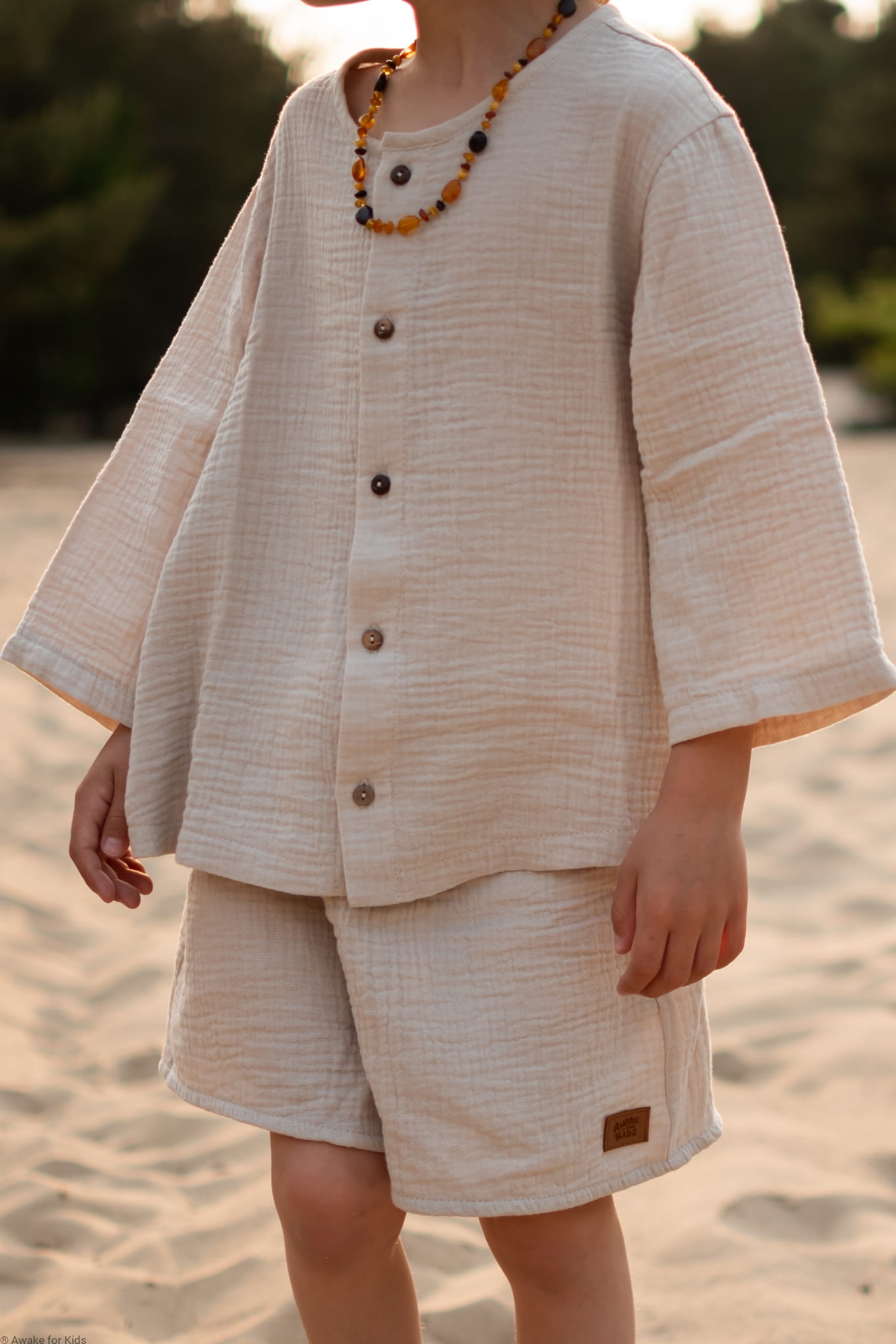 Koszula i spodenki uszyte z muślinu w kolorze jasnego ciepłego beżu